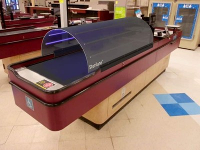 Sterilane™ is comprised of an anti-microbial sheet of malleable plastic fitted with high power UVC strips. The plastic sheet, when bent 180 degrees forms a semi-hemispherical dome, that when attached to a check-out lane, utilizes ultra violet light to eradicate lingering viruses and bacteria on consumer products as they travel down the conveyor belt.