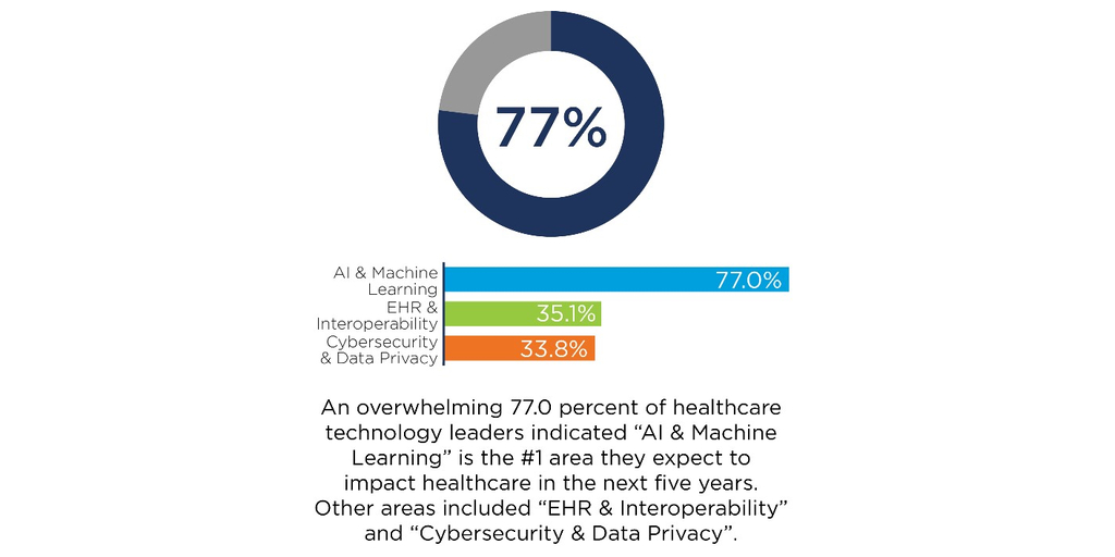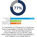 - 77.0% of respondents indicated AI and machine learning, followed by EHR and interoperability (35.1%), are expected to have the greatest impact on healthcare over the next five years.