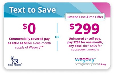 The Wegovy® savings offer gives cash-paying patients or those with commercial insurance that does not cover obesity medicines access to a 28-day supply (one box) of Wegovy® for $499. Patients enrolled in government-funded healthcare programs are not eligible for these savings offers. Patients with commercial insurance that does cover Wegovy® may pay as little as $0 per month with a maximum savings of $225 for a 28-day supply of Wegovy®. Novo Nordisk is offering self-paying patients who are new to Wegovy® their first month of medicine for $299 through July 31, 2025. For subsequent months, self-paying patients will pay $499 per month.