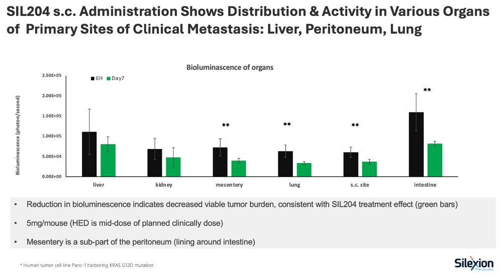 The study evaluated SIL204’s biodistribution and therapeutic activity following subcutaneous administration in a metastatic pancreatic cancer mouse model using bioluminescent imaging. Results confirmed that SIL204 distributed to key organs where pancreatic cancer commonly spreads, with measurable reductions in tumor burden observed across multiple sites.