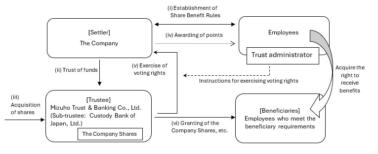 Each Group company awards points to employees and grants the Company Shares, etc. equivalent to the awarded points when vesting conditions are met. The shares to be granted to employees shall be acquired, including future allocations, using funds placed in a trust established in advance and shall be segregated and managed as trust assets.