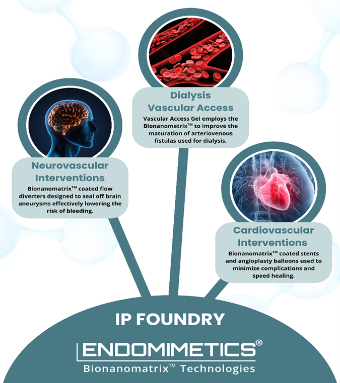 Endomimetics is a biotechnology company developing Bionanomatrix™ ‑based products designed to enhance healing and performance of implantable devices and surgical procedures in vascular and other high‑value clinical indications. Operating as a centralized R&D and IP Foundry, Endomimetics generates de‑risked applications that are licensed into standalone operating companies, creating a repeatable engine for company formation and strategic value creation.
